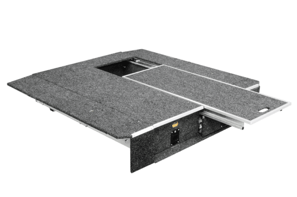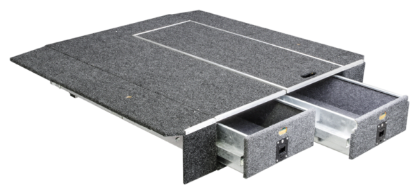 Het ladekastsysteem is aan bovenzijde over de gehele breedte en lengte van de laadbak vlak afgewerkt, waardoor u een strakke, optimaal te benutten laadruimte heeft. U heeft hierbij geen verlies door de wielkasten, omdat de ontstane ruimtes voorzien zijn van uitneembare panelen aan bovenzijde. In deze ruimtes kunt u bijvoorbeeld vaste accesoires als een compressor, omvormer of boordaccu kwijt, of bijvoorbeeld losse spullen die u minder vaak nodig heeft. Bij de Extra cab zit er aan voorzijde in de laadbak een extra ruimte met uitneembaar panelen, vanwege de langere laadbaklengte.